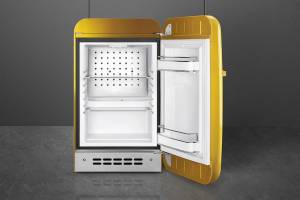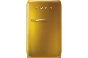 Frigider minibar retro Smeg FAB5RDGO5, cu maner auriu si usa nereversibila. Echipat cu racire statica, dezghetare automata, 2 rafturi reglabile si iluminare LED, acest frigider adauga un plus de eleganta retro si functionalitate moderna, fiind ideal pentru spatii mici si eficiente.
