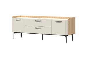 Comoda tv cu 2 usi si 2 sertare AIR 175x63x47cm Pepper White/ stejar Furneo - sticla cu model de marmura Calcatta Oro, cadru, picioare si manere Antracit
