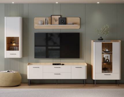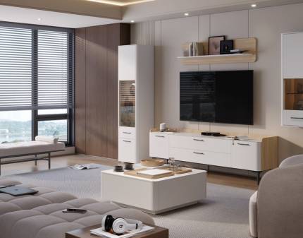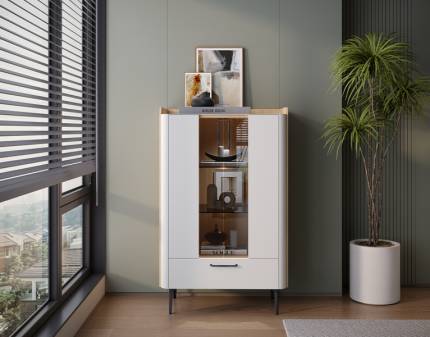 Vitrina lata cu 2 usi si 1 sertar AIR 82x132x46cm Pepper White/ stejar Furneo - sticla gri Parsol, cadru, picioare si manere Antracit