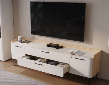 Comoda tv cu 2 usi si 2 sertare AIR 209x63x47cm Pepper White/ stejar Furneo - sticla cu model de marmura Calcatta Oro, cadru, picioare si manere Antracit